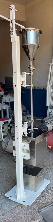上方為待用砂桶,砂桶下安裝不銹鋼碟閥,碟閥下方為不銹鋼管。該組件可以上下調(diào)節(jié),不同工藝可以調(diào)節(jié)砂子落下的高度。下方為被檢測產(chǎn)品安裝夾具,夾具可以調(diào)節(jié)多種角度。底部為收集砂桶,以備回收二次使用。